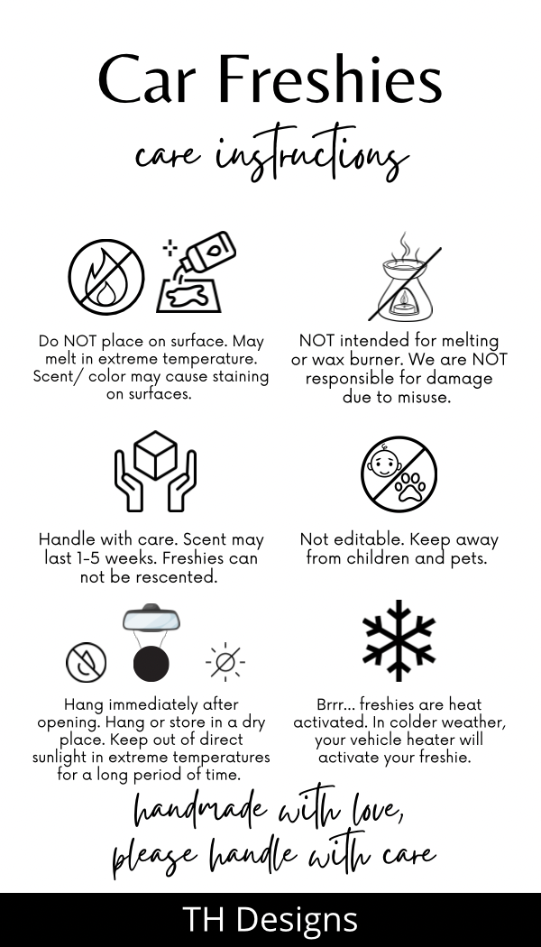 Our freshies are handcrafted scented air fresheners designed to bring long-lasting fragrance to your car, home, or any space you love. Each one is heat-activated, meaning they release their best scent during warmer months or when your heat is on.